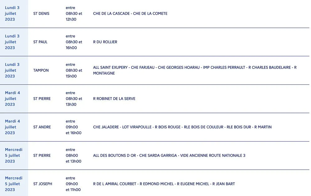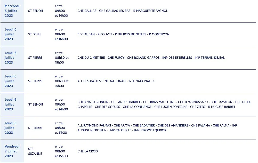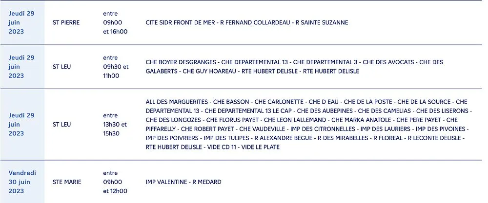 EDF à La Réunion souhaite informer l’ensemble de ses clients résidant dans les communes de Saint-Pierre, Sainte-Marie et Saint-Leu, St-Joseph, St-Denis, St-Paul, St-André, St-Benoit, Ste-Suzanne qu’ils seront affectés par des coupures d’électricité planifiées pour des travaux prévus entre le jeudi 29 juin et le vendredi 7 juillet 2023.