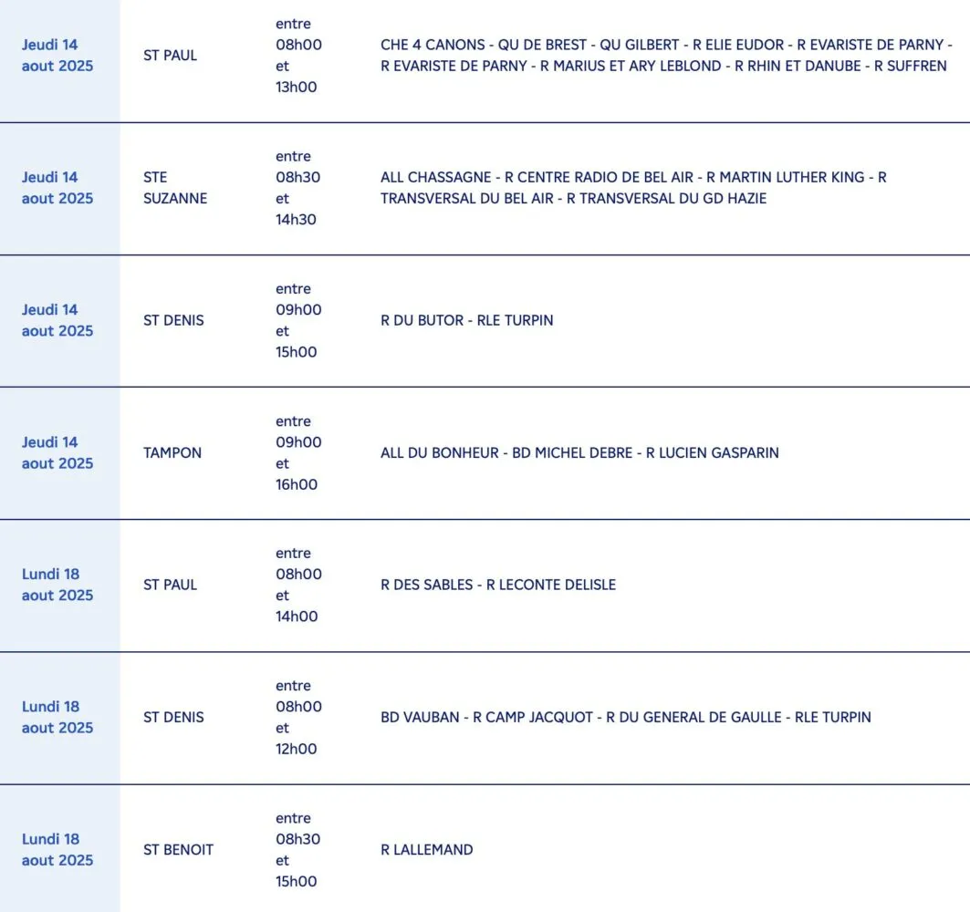 • Saint-Denis (09h00 – 15h00) : Allée des Pluies d’Or, Chemin des Mûriers, Lotissement Les Mûriers, Route du Bois de Nèfles, Route du Piton.