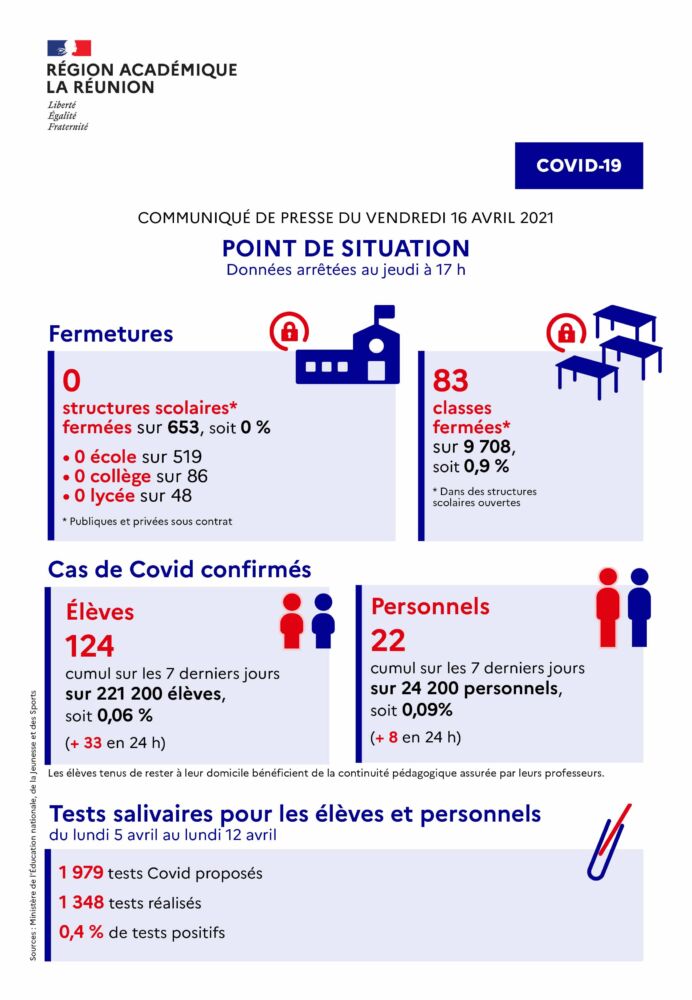 Le  point de situation hebdomadaire Covid- 19 ce vendredi 16 avril 2021 pour l’académie (données arrêtées au jeudi 15 avril à 17h) indique que 146 cas confirmés ont été enregistrés dans les établissements scolaires ces 7 derniers jours. 124 cas concernent notamment les élèves.