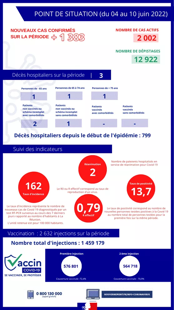 Pour la semaine du 4 au 10 juin 2022 à La Réunion, le nombre de cas hebdomadaires s’établit à 1 383 contre 1 924 la semaine précédente, correspondant à un taux d’incidence en baisse de 162 pour 100 000 habitants contre 225 la semaine dernière. Le taux de positivité est également en baisse pour atteindre 13,7 % (16 % la semaine précédente).