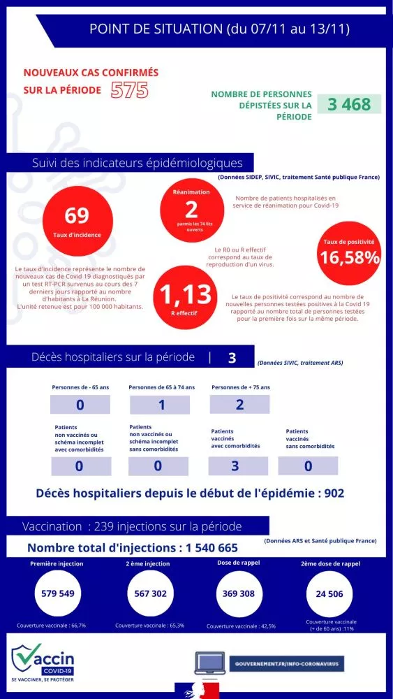 Le point de situation hebdomadaire de la Covid-19 à La Réunion indique que 575 nouveaux cas ont été recensés sur l’île du 7 au 13 novembre dernier. Ce, sur les 3 468 personnes dépistées. Le nombre de décès hospitaliers enregistrés sur cette période s’élève à 3 dont deux personnes âgées de plus de 75 ans qui étaient des patients vaccinés avec comorbidités.