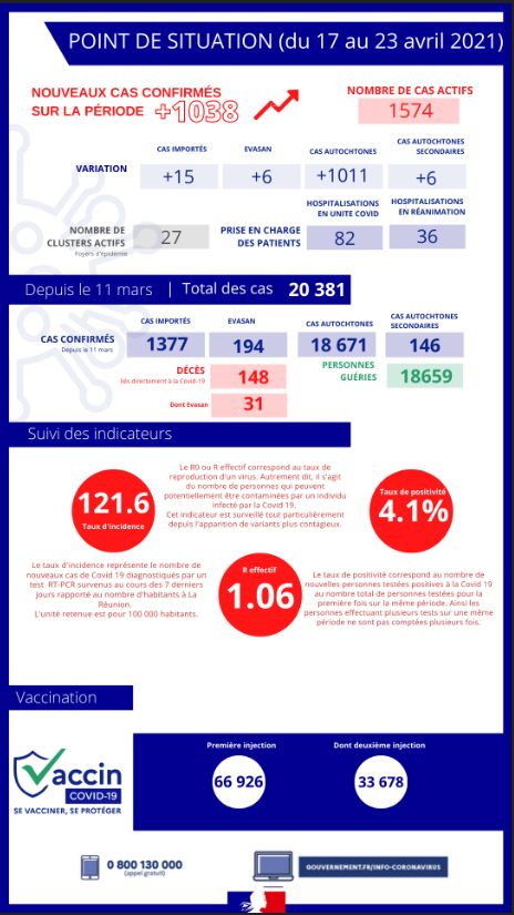 Les indicateurs démontrent cette semaine une situation sanitaire qui se dégrade ce qui prouve que l’épidémie de Covid-19 se poursuit activement à La Réunion. Il est important pour chacun de continuer à être vigilant en toute circonstance : maintenir les gestes barrières, limiter ses contacts sociaux et respecter la mesure du couvre-feu.