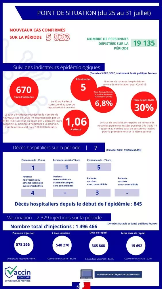 Du 25 au 31 juillet 2022 à La Réunion, le nombre de cas hebdomadaires se stabilise avec 5 823 nouveaux cas contre 5 687 la semaine précédente.