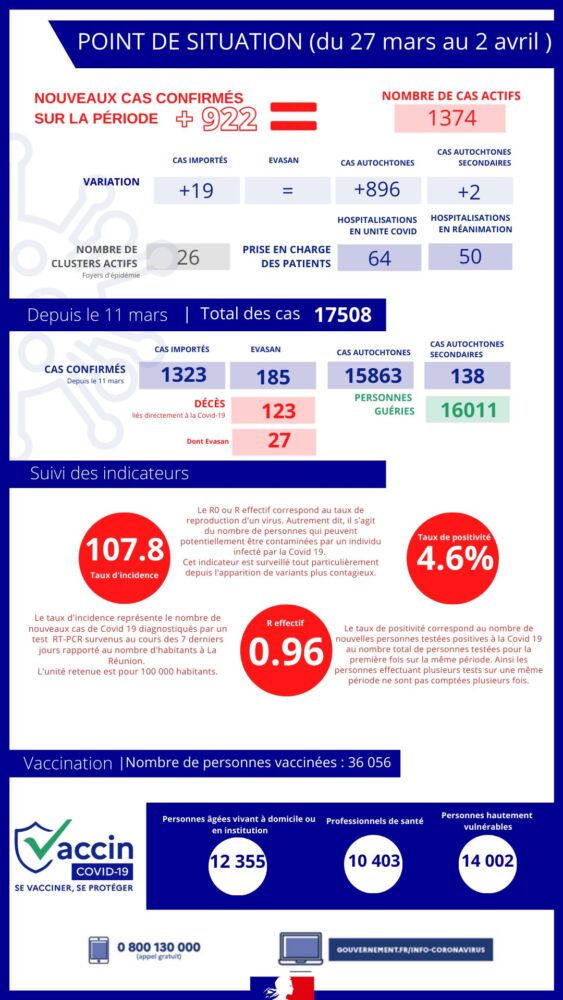 La préfecture et l’Agence Régionale de Santé ont le regret d’annoncer ce mardi 6 avril 2021 les décès intervenus au cours des 7 derniers jours de 8 patients âgés de plus de 50 ans, dont 2 patients arrivés à La Réunion au titre des Evasan contre 1025 cas la semaine précédente soit un taux d’incidence de 120/100 000 .