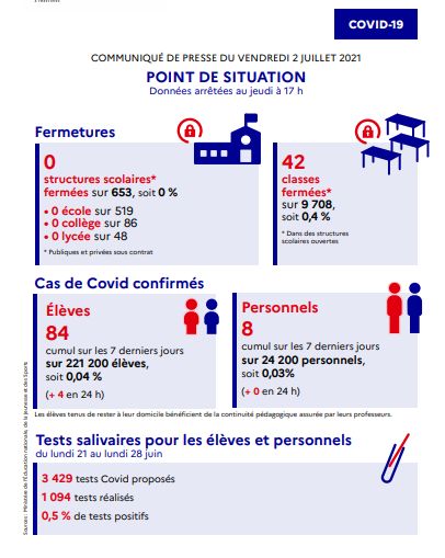 Le point de situation hebdomadaire Covid- 19 de ce vendredi 2 juillet de l’académie fait état de 84 élèves et 8 personnels positifs et 42 classes fermées .