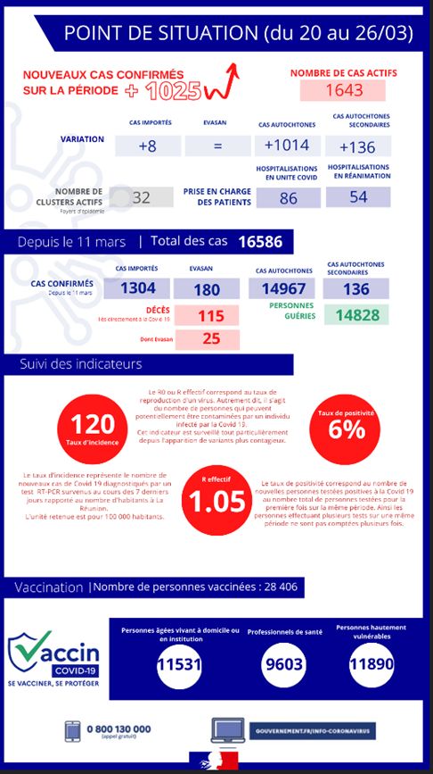 Les indicateurs montrent une aggravation de la situation avec une poursuite active de l’épidémie de Covid-19 à La Réunion. En toute circonstance, au travail, en famille ou entre amis, il est essentiel que chacun continue à être vigilant : maintenir les gestes barrières, limiter ses interactions sociales et respecter la mesure du couvre-feu. Il est également essentiel pour les personnes prioritaires de se porter volontaire pour la vaccination.