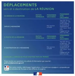 Depuis le 16 mai 2022, les conditions de voyage au départ et à destination de la Réunion sont les suivantes :