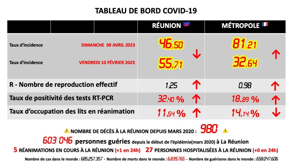 À La Réunion, 980 décès depuis le début de l’épidémie en mars 2020, avec un taux d’incidence : 46,5 selon Santé Publique France au dimanche 09 avril 2023.