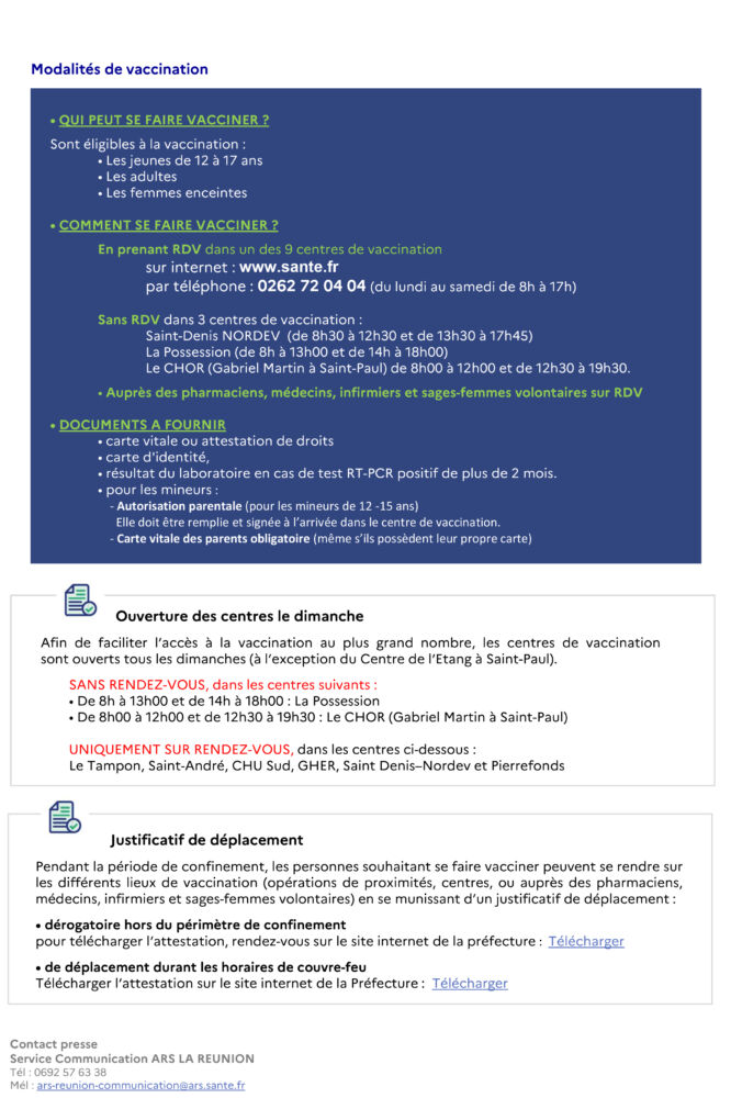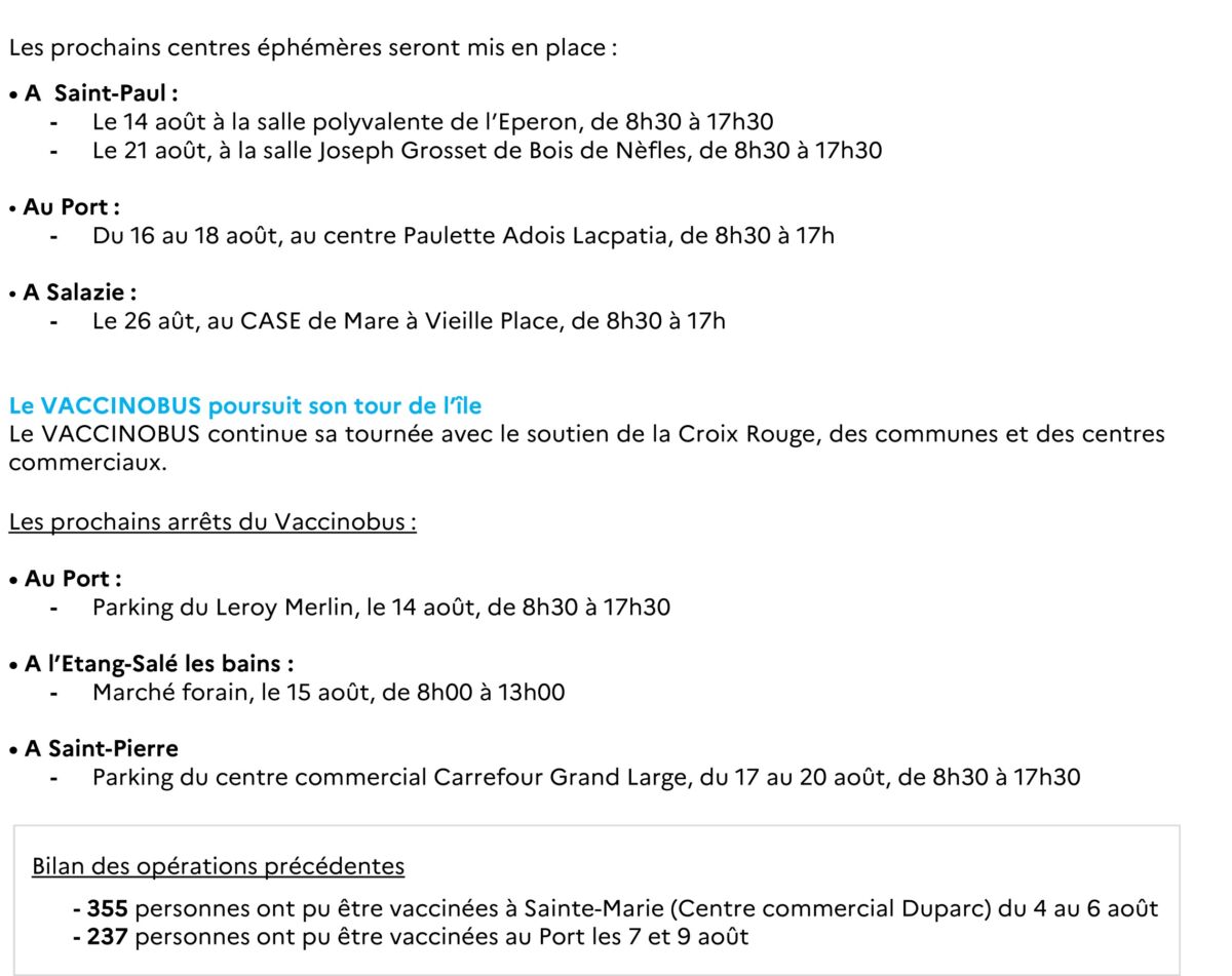 Pour faciliter davantage l’accès des Réunionnais à la vaccination, l’ARS continue de mettre en place des opération de proximité (centres éphémères et Vaccinobus), en lien avec la Croix Roue, le CHU, les communes et les centres commerciaux.