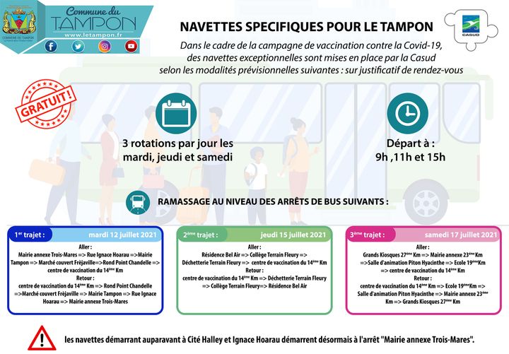 Collectivités/Le Tampon Covid-19 : des navettes gratuites mises en place par La Rédaction 12 juillet 2021 1 min de lecture Dans le cadre de la campagne de vaccination contre la Covid-19, des navettes gratuites sont mises en place. Planning du 13 au 17 juillet. Plus d’infos dans les mairies annexes et centres municipaux. Ne manquez pas toute l’actualité de La Réunion ! Abonnez-vous à la newsletter de Free Dom ! Valider Partager Facebook Twitter Pinterest Linkedin Whatsapp Reddit Email Catégorie: Covid-19Tampon Vous pourriez être intéressé par 29 décembre 2025 Point sur le réseau routier départemental, 29 décembre à 16H30 29 décembre 2025 Fortes pluies : appel à la plus grande prudence à Saint-Paul 29 décembre 2025 Intempéries : radiers submergés à Trois Bassins et à Saint-Paul La Rédaction Laisser un commentaire Annuler la réponseYour email address will not be published. Enregistrer mon nom, mon e-mail et mon site dans le navigateur pour mon prochain commentaire. Current ye@r * Leave this field empty Article précédent Cérémonie d’ouverture de la campagne sucrière à Grands-Bois Article suivant Grande braderie de St-Paul : un retour en toute sécurité Articles récents... Mercredi 31 décembre 2025 – Météo, éphéméride et horoscope du jour Hommage à Johnny Hallyday sur Free Dom 2 ce 5 décembre Mardi 30 décembre 2025 – Météo, éphéméride et horoscope du jour Saint-Joseph : découverte de 2337 plants de cannabis, arrestation de 2 individus Point sur le réseau routier départemental, 29 décembre à 16H30 Suicide sur le pont de la Rivière d’Abord : importante mobilisation des secours et des forces de l’ordre Radier submergé à Ilet Furcy : la route de Cilaos fermée à la circulation cette nuit Fortes pluies : appel à la plus grande prudence à Saint-Paul Saint-Gilles-les-Bains : une route impraticable, les riverains montent au créneau (VIDEOS) Très grands excès de vitesse : un délit passible de prison depuis le 29 décembre 2025