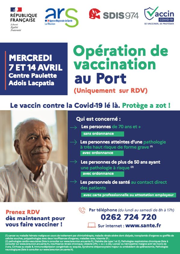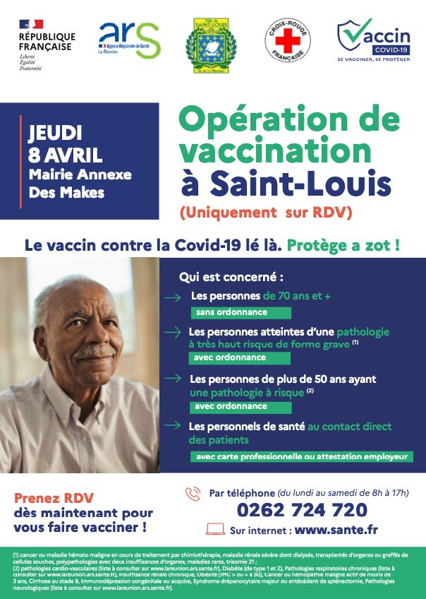 Afin de faciliter l’accès à la vaccination aux habitants de Saint-Louis et du Port, l’ARS, en lien avec les communes, le SDIS et la Croix Rouge, organise des opérations de vaccination de proximité pour – aller vers . les habitants du Port et de Saint-Louis. Ces opérations se dérouleront les 7 et 14 avril au Port et le 8 avril à Saint-Louis. Les publics concernés (personnes de 70 ans et plus, personnes de tout âge ayant une pathologie à très haut risque, personnes de à partir de 50 ans ayant une pathologie à risque, et personnels de santé au contact direct des patients) sont invités à prendre rendez-vous par téléphone ou internet pour se faire vacciner contre la Covid-19.