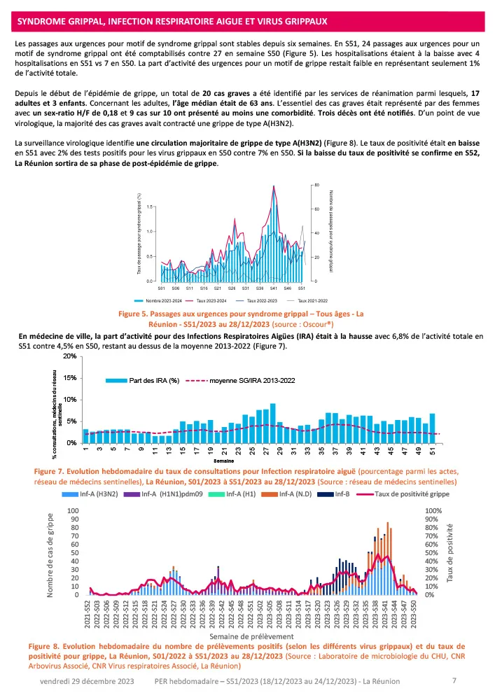 •  Grippe : La Réunion reste dans un contexte de post-épidémie avec des indicateurs qui se stabilisent depuis maintenant plusieurs semaines. Le taux de positivité était à la baisse en S51. Si cette baisse se confirme en S52, La Réunion sortira de sa phase de post-épidémie de grippe.