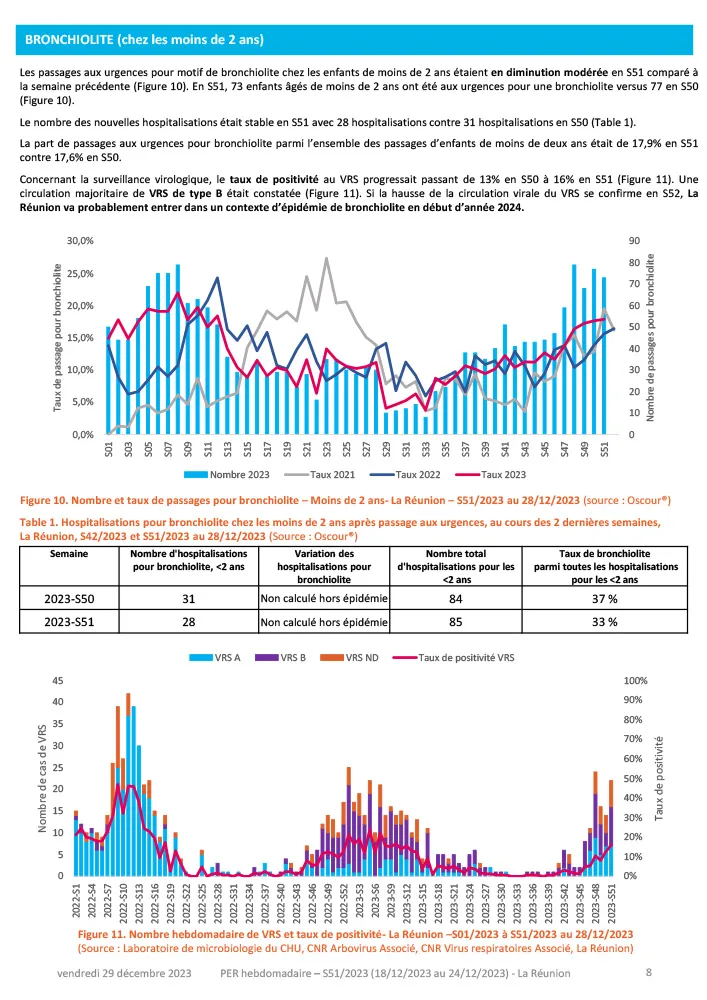 •  Bronchiolite chez les moins de 2 ans : Les indicateurs étaient stables en S51 en comparaison à la S50. la circulation virale du VRS était à la hausse en S51. Si cette hausse se confirme en S52, La Réunion va probablement entrer dans un contexte d’épidémie de bronchiolite en début d’année 2024.