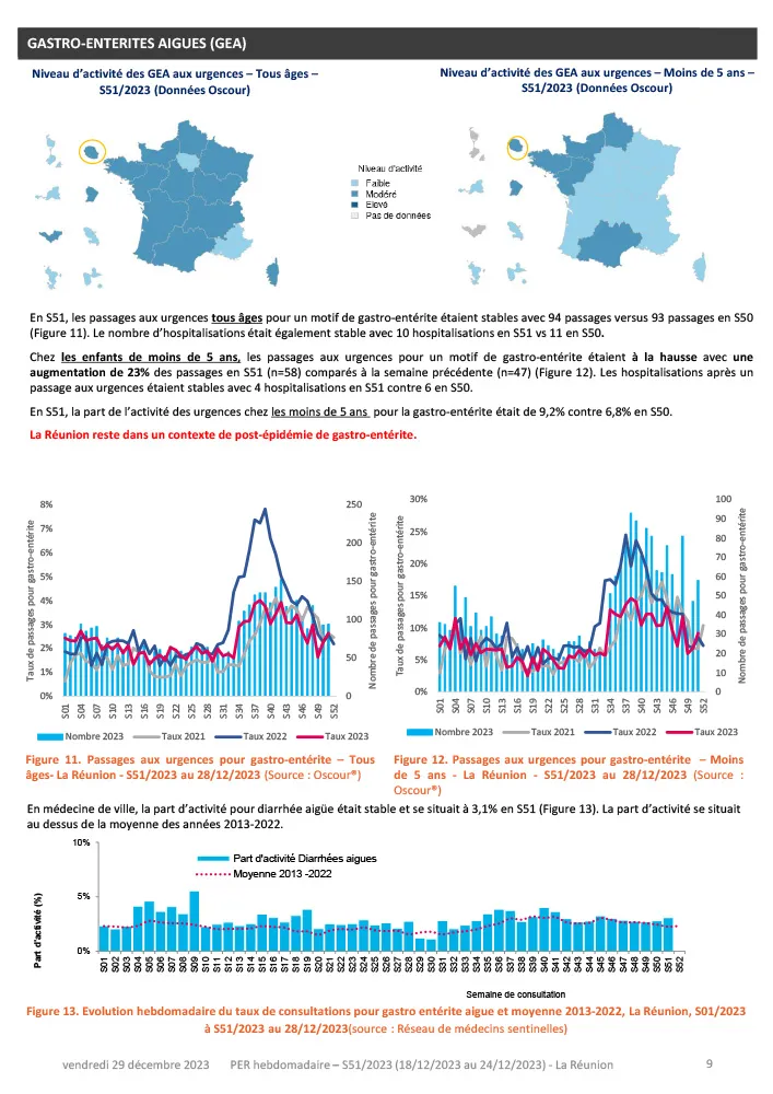 •  Gastro-entérite : La Réunion est en phase de post-épidémie de gastro-entérite. Les indicateurs restaient stables sur les 3 dernières semaines.