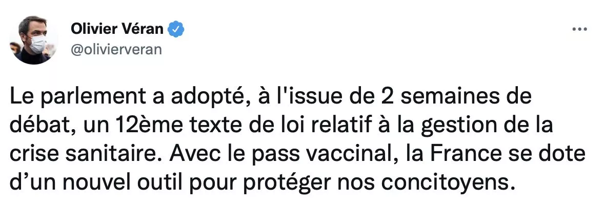 Olivier Véran : « Le parlement a adopté, à l’issue de 2 semaines de débat, un 12ème texte de loi relatif à la gestion de la crise sanitaire. Avec le pass vaccinal, la France se dote d’un nouvel outil pour protéger nos concitoyens. »