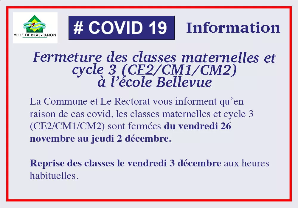 Sur ordre de l’ARS, la municipalité de Bras-Panon en étroite collaboration avec le rectorat, a pris la décision de fermer des classes de maternelles et de primaire à l’école de Bellevue en raison de cas contact au sein de l’établissement scolaire. La reprise des cours est prévue le jeudi 2 décembre.