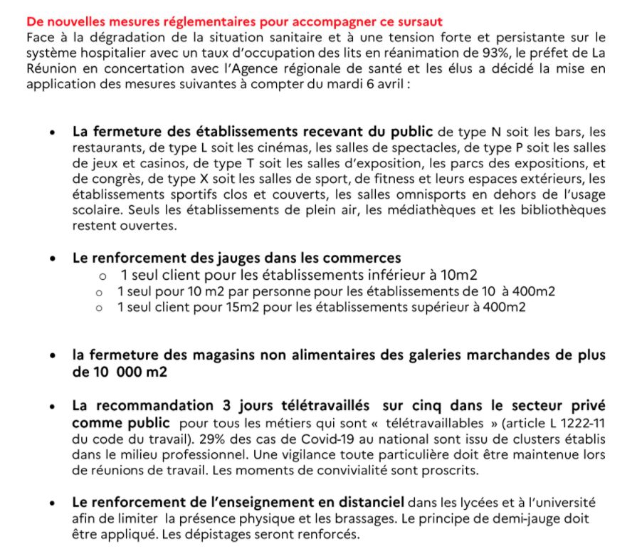 Les annonces faites vendredi dernier par le préfet de la Réunion s’appliquent ce mardi 6 avril 2021.Il s’agit de plusieurs mesures pour lutter contre la progression du Coronavirus dans notre département. Aujourd’hui entrent donc en vigueur la fermeture complète des restaurants, bars, cinémas. Seule la vente à emporter et la livraison seront autorisées.