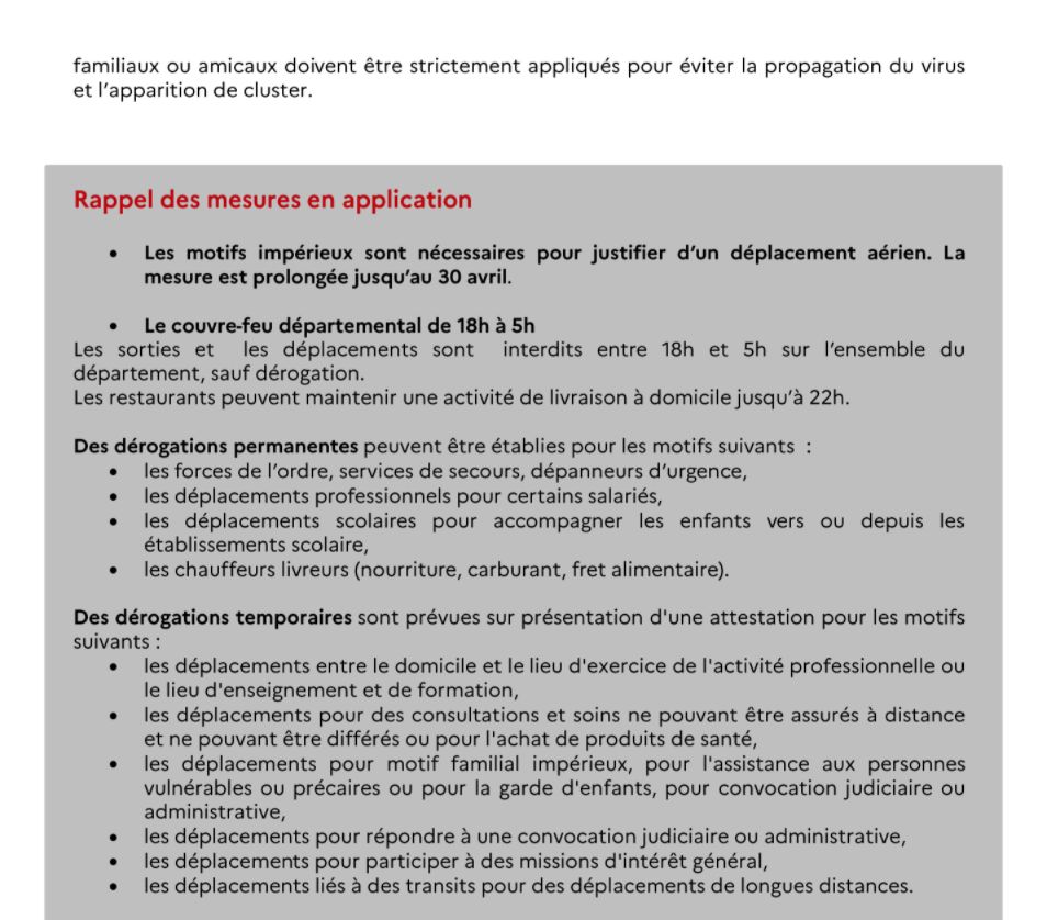 Le couvre feu est maintenu en l’état, et les motifs impérieux sont reconduits jusqu’à au moins, la fin avril a encore indiqué Jacques Billant.