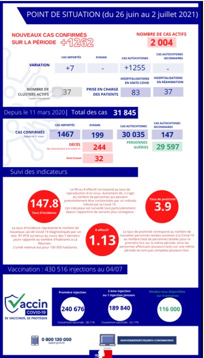 La circulation du virus Covid-19 s’accélère à La Réunion. La présence préoccupante dans l’île du variant Delta, connu pour sa contagiosité, impose à chacun de respecter les gestes barrière et ne pas retarder sa vaccination.