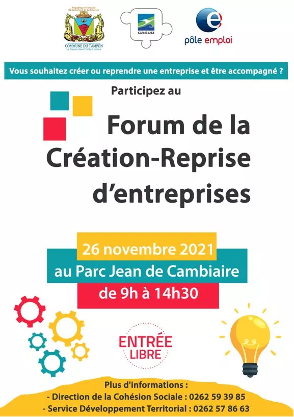 D’autres préfèrent agir. Pour soutenir et aider les futurs entrepreneurs , la Commune du Tampon organise, en partenariat avec la CASUD et le Pôle Emploi du Tampon, un « Forum de la création-reprise d’entreprises » à destination des porteurs de projet et entreprises nouvelles du Tampon