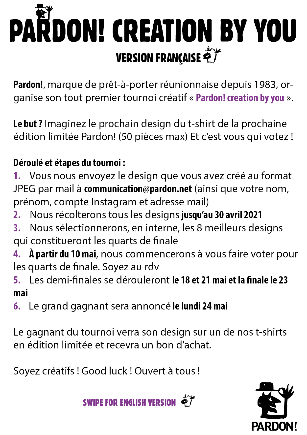 Nos jeux en cours Créez votre design pour la marque Pardon! par La Rédaction 15 avril 2021 1 min de lecture L’enseigne locale a lancé son grand jeu « Pardon! creation by you ». Le but est de vous donner la possibilité de créer un design qui figurera sur une édition limitée de t-shirts. Pour participer, c’est simple : Ne manquez pas toute l’actualité de La Réunion ! Abonnez-vous à la newsletter de Free Dom ! Valider Partager Facebook Twitter Pinterest Linkedin Whatsapp Reddit Email Catégorie: Pardon Vous pourriez être intéressé par 26 décembre 2025 FreedoQuotidien : 2 500€ à remporter ce 30 décembre 15 novembre 2025 FreedoQuotidien : Tante Dida gagne 2300€ et reste zen (grâce à la radio) ! 21 juillet 2025 10 places à gagner pour le concert La Flamme Kreol le 2 août à Saint-Paul La Rédaction Laisser un commentaire Annuler la réponseYour email address will not be published. Enregistrer mon nom, mon e-mail et mon site dans le navigateur pour mon prochain commentaire. Current ye@r * Leave this field empty Article précédent Freedomillion : la cagnotte tombe en ce 1er avril ! Article suivant Myrielle Sery remporte deux bracelets assortis grâce à Chaleur Tropicale ! Articles récents... Hommage à Johnny Hallyday sur Free Dom 2 ce 5 décembre Mardi 30 décembre 2025 – Météo, éphéméride et horoscope du jour Saint-Joseph : découverte de 2337 plants de cannabis, arrestation de 2 individus Point sur le réseau routier départemental, 29 décembre à 16H30 Suicide sur le pont de la Rivière d’Abord : importante mobilisation des secours et des forces de l’ordre Radier submergé à Ilet Furcy : la route de Cilaos fermée à la circulation cette nuit Fortes pluies : appel à la plus grande prudence à Saint-Paul Saint-Gilles-les-Bains : une route impraticable, les riverains montent au créneau (VIDEOS) Très grands excès de vitesse : un délit passible de prison depuis le 29 décembre 2025 Fermeture temporaire du sentier de la Canalisation des Orangers (cirque de Mafate)