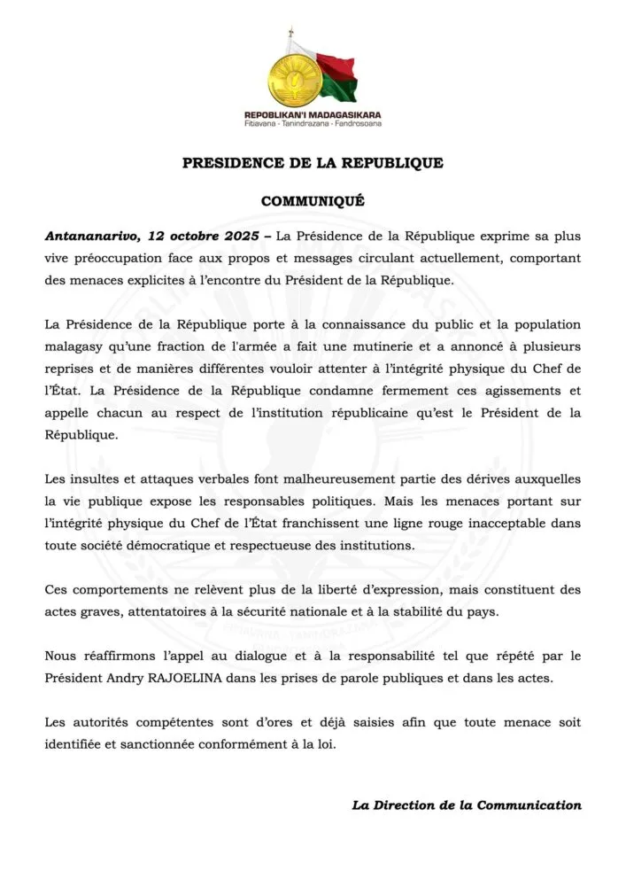 La présidence de la République  de Madagascar révèle des « menaces » envers le président