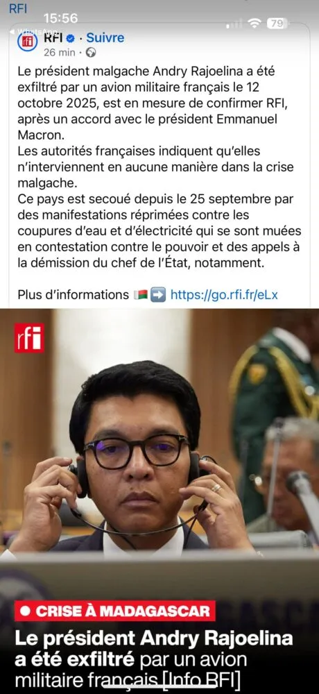Dans son article publié ce lundi, RFI a indiqué que le président malgache a été exfitré par un avion militare français après un accord avec le président français, Emmanuel Macron!