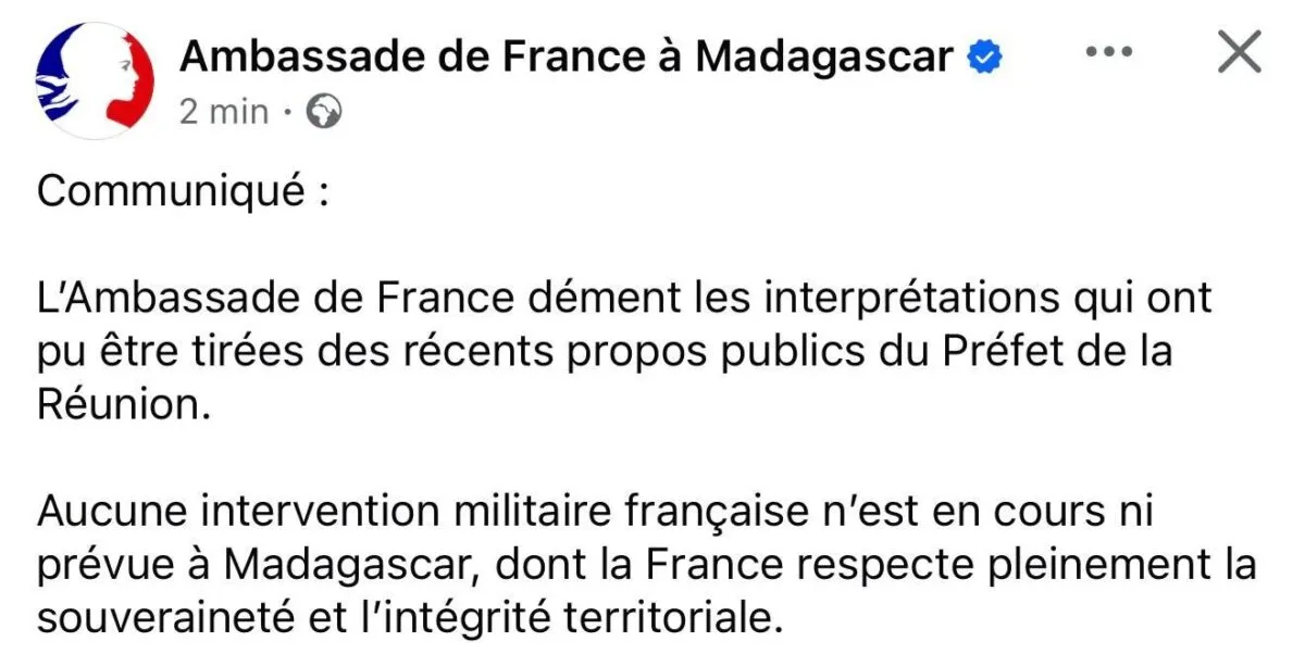 L’Ambassade de France à Madagascar dément, dans un communiqué de presse, les interprétations qui ont pu être tirées des récents propos publics du Préfet de la Réunion, indiquant que la France est prêt à toutes éventualités. « Aucune intervention militaire française n’est en cours ni prévue à Madagascar, dont la France respecte pleinement la souveraineté et l’intégrité territoriale. »