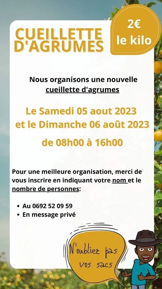 Plongez au cœur de la saison des agrumes avec Mr. Luguy YEBO, l’agriculteur passionné des hauts de Petite-Ile ! Une occasion unique s’offre à vous, car il ouvre à nouveau les portes de son exploitation aux visiteurs pour une cueillette au sein du magnifique site de Piton de Bloc. Préparez-vous à vivre cette expérience fruitée les samedi 5 et dimanche 6 août 2023, de 8h à 16h.
