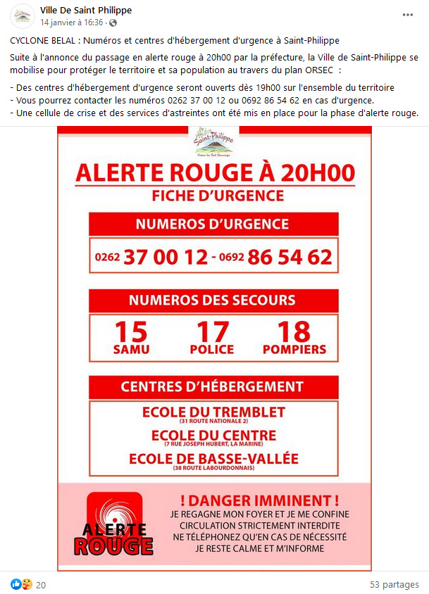 D’ailleurs, le service communication de la ville de Saint-Philippe confirme bien qu’aucun centre n’était ouvert sur la commune à ce moment là puisque un communiqué publié sur les réseaux sociaux (copie d’écran ci-joint) informe que les centres seront ouverts seulement 1 heure avant le passage en alerte rouge.