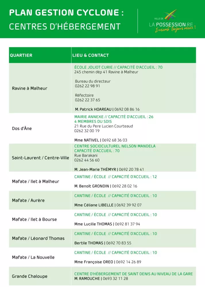 – l’ouverture depuis hier soir, de 3 centres d’hébergement à l’École du Centre, l’École primaire de Vincendo et à l’Ecole de Grand Galet.