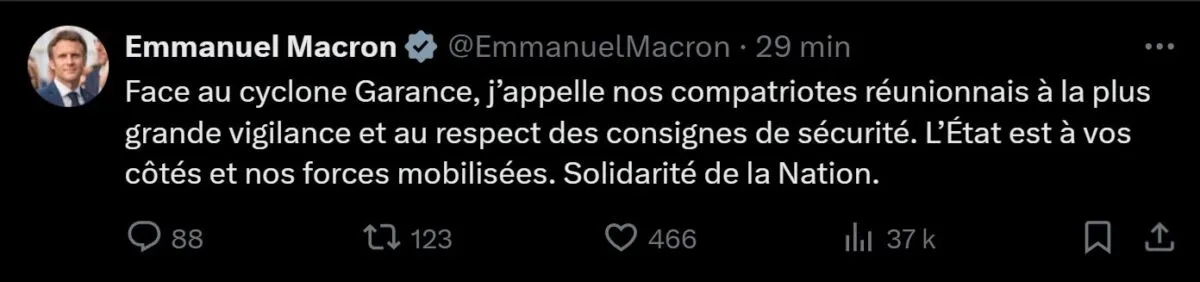 « Face au cyclone Garance, j’appelle nos compatriotes réunionnais à la plus grande vigilance et au respect des consignes de sécurité », déclare-t-il sur les réseaux sociaux.