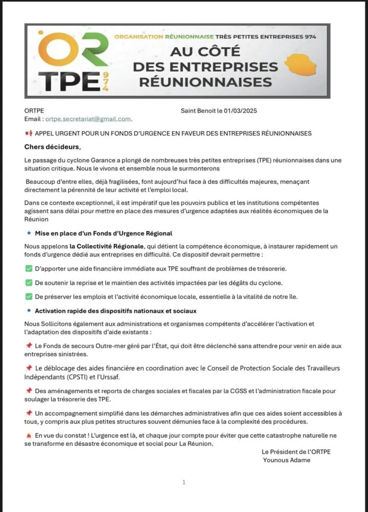 L’Organisation Réunionnaise de Très Petites Entreprises (ORTPE) exhorte la Collectivité Régionale à instaurer rapidement un fonds d’urgence. Ce dispositif a pour objectif d’apporter une aide financière immédiate aux TPE en difficulté, de soutenir la reprise des activités touchées par les dégâts du cyclone, et de préserver l’emploi local, essentiel à la vitalité économique de l’île. L’ORTPE insiste sur la nécessité d’agir sans délai pour éviter un désastre économique plus profond.
