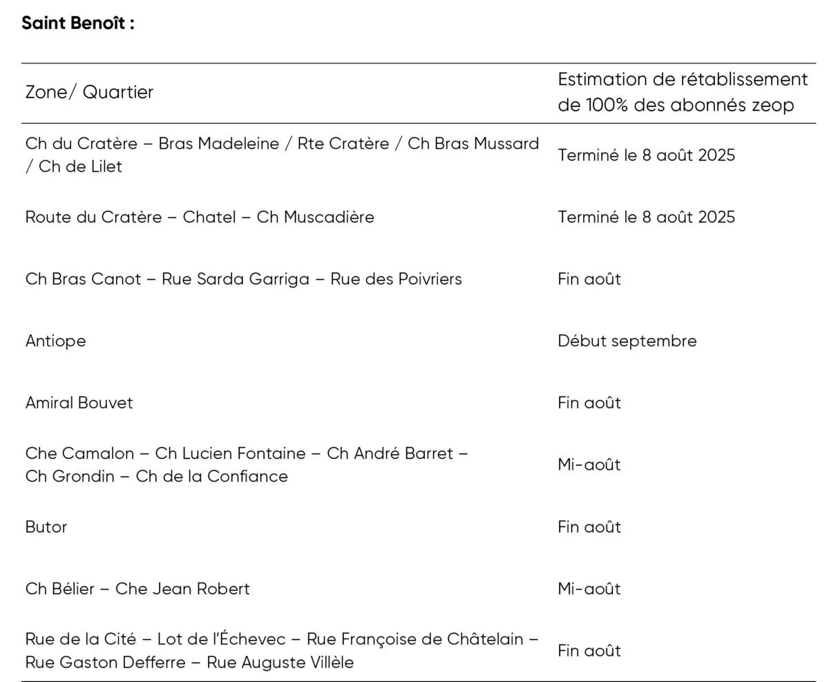 Dans la continuité de ses précédentes communications, zeop & Réunicable diffusent aujourd’hui une nouvelle mise à jour des délais prévus pour le rétablissement complet des services fibre dans les communes de Sainte-Marie, Saint-André, Sainte-Suzanne et Saint-Benoît.