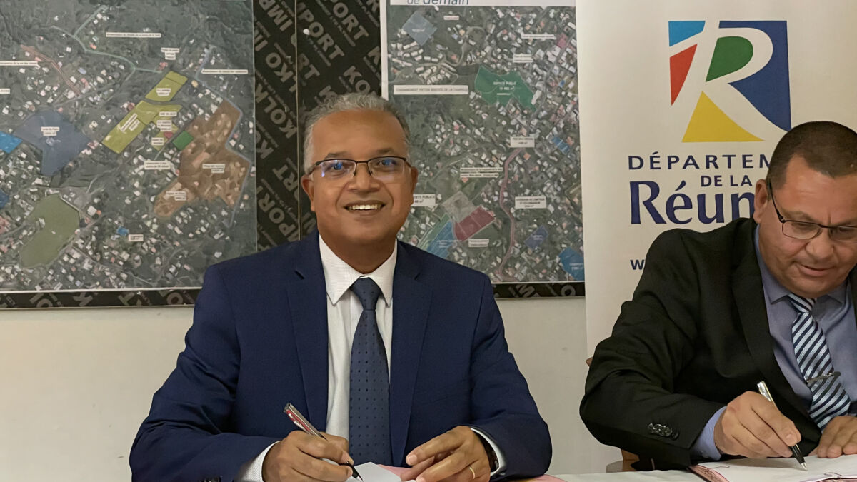 Autre moment fort de la visite : la signature du PST2 pour Cilaos dans la salle multimédia Piton-des-Neiges par le Président du Conseil départemental et le maire de Cilaos, Jacques Técher.