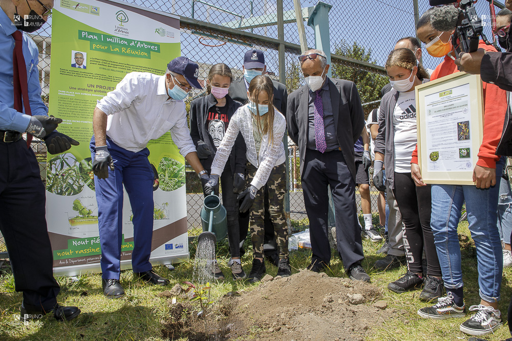 Le président de la Casud, André Thien-Ah-Koon, était au côté du Président Cyrille Melchior pour mettre en terre des plants dans le jardin du collège Alsace Corré. Deux fois champion du concours d’embellissement des collèges (en 2017 et en 2021), Alsace Corré fait partie des premiers établissements à avoir bénéficié de la « dotation biodiversité » du Département pour la création d’un arboretum qui produira des semences pour le Plan 1 million d’arbres. « Je ne pouvais pas venir à Cilaos sans visiter ce collège, double champion du concours d’embellissement, et sans féliciter les équipes éducatives et les collégiens pour leur engagement dans cette démarche. C’est une grande fierté pour moi d’être ici. Nous avons souhaité impulser une nouvelle phase dans le travail de sensibilisation et d’effort collectif en faveur des enjeux environnementaux, en lançant en 2019 le plan 1 million d’arbres. Ce n’est que la partie la plus visible d’un vaste plan de transition écologique et solidaire élaboré et mis en œuvre par le Département. Il faut penser et agir écologie ! » a insisté Cyrille Melchior.