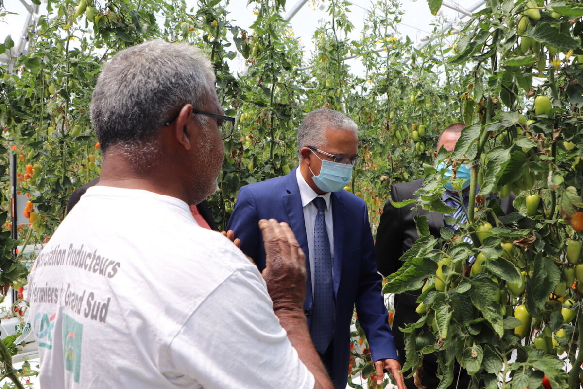Après le tourisme et le sport, place à l’agriculture, avec la visite d’une exploitation de Cilaos ; l’occasion pour Cyrille Melchior de manifester sa solidarité avec le monde agricole. Monsieur Payet est producteur de légumes (lentilles, ail, tomates plein champ, chou, etc.), sur un terrain de 1 ha. Il a souhaité développer sur une partie de sa parcelle des cultures sans abris pour mieux maîtriser ses productions et limiter l’application de produits phytosanitaires. Pour mener à bien ses travaux, estimés à plus de 16 500 €, il a bénéficié d’une aide de plus de 14 000 € dans le cadre de la démarche LEADER prévue dans le PDRR 2014-2020 cofinancé par le FEADER qui lui a permis de financer l’installation d’une serre équipée, de 480m². « Cilaos est un territoire fragile. On doit accompagner les efforts des agriculteurs de Cilaos. Leurs productions sont tout simplement remarquables et ils méritent d’être soutenus. Dans le domaine agricole, je veux que le Département exprime toute sa solidarité à travers l’accompagnement du développement des circuits courts et de l’agriculture raisonnée et bio ».