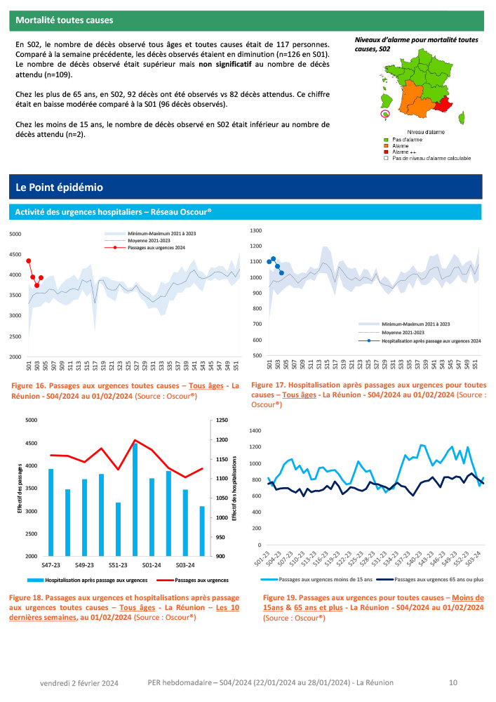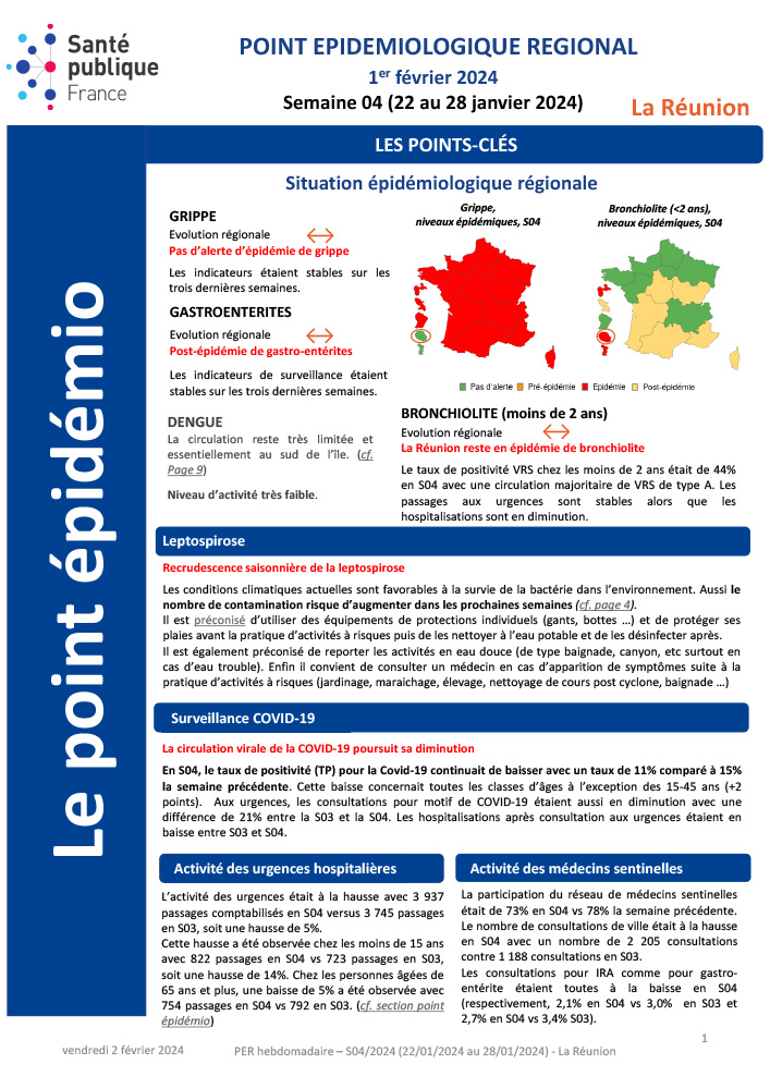 - Bronchiolite chez les moins de 2 ans : La Réunion reste en épidémie de bronchiolite. Le taux de positivité VRS chez les moins de 2 ans était stable à 44% en S04 avec une circulation majoritaire de VRS de type A.
