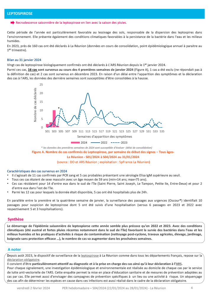 - Leptospirose : Démarrage de l’épidémie saisonnière de leptospirose à La Réunion (cf. Page 4)