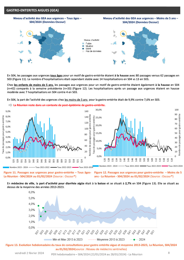 - Gastro-entérite : La Réunion reste en phase de post-épidémie de gastro-entérite. Les indicateurs étaient à la hausse en S04 en comparaison à la semaine précédente.
