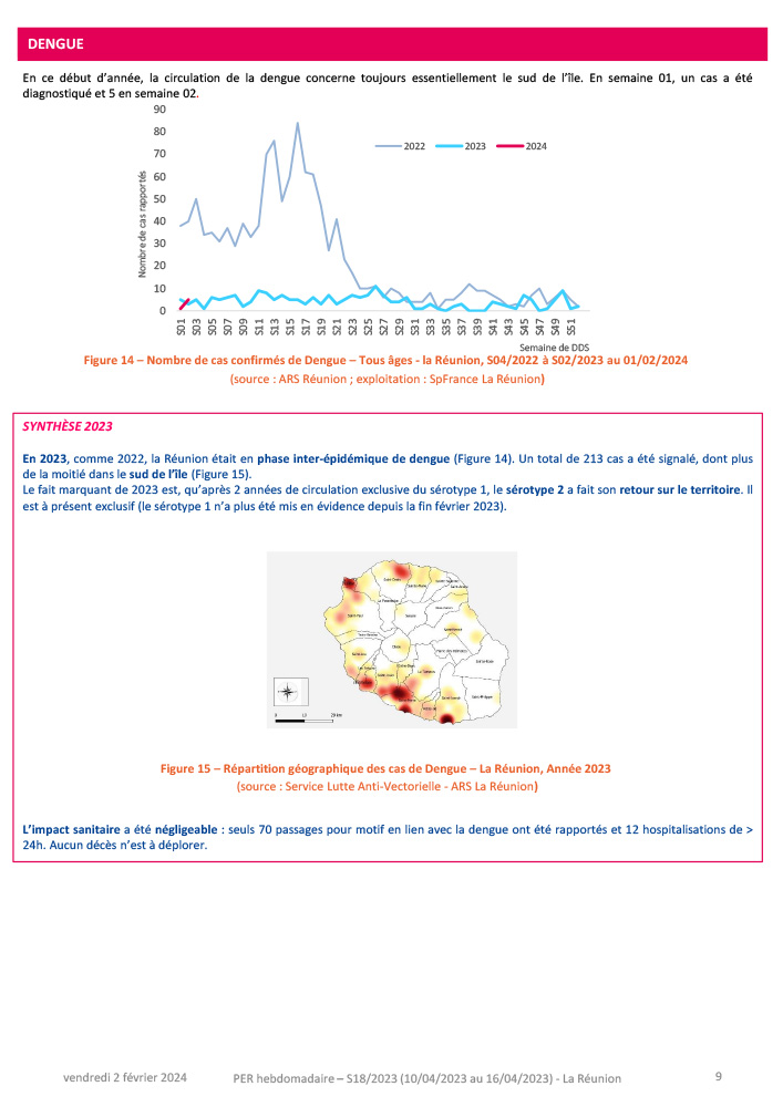 - Dengue : La Réunion est en phase inter-épidémique de dengue. La circulation reste très limitée et essentiellement cantonnée au sud de l’île.