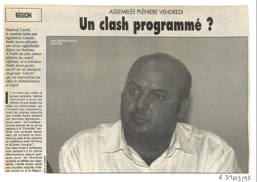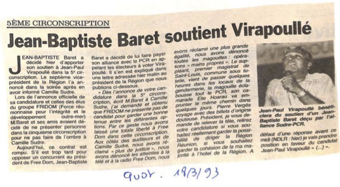 L’année suivante, il se désolidarise de Camille Sudre et soutient Jean-Paul Virapoullé dans la 5eme circonscription et Jean-François Bosviel dans la deuxième circonscription aux législatives de 1993….