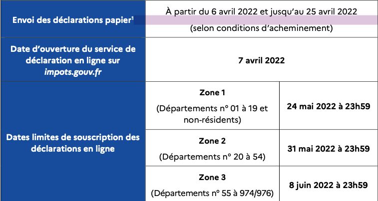 Pour les usagers ne pouvant pas déclarer en ligne, la date limite de dépôt des déclarations papier est fixée au 19 mai 2022 à 23h59 (y compris pour les résidents français à l’étranger), le cachet de La Poste faisant foi.