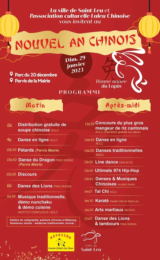 La Ville de Saint-Leu et l’Association Culturelle Laleu Chinoise vous invitent à fêter la nouvelle année du Lapin d’Eau, signe de bonheur et de prospérité, le dimanche 29 janvier 2023 de 8h à 18h dans le Parc du 20 Décembre et sur le parvis de l’Hôtel de ville.