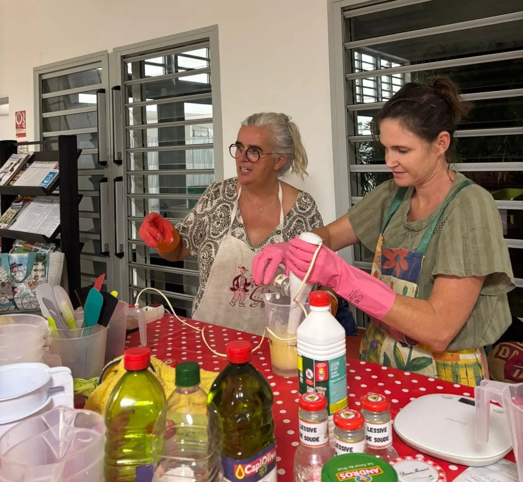 Un second atelier, au Port, était consacré aux produits ménagers et cosmétiques faits maison. Il était co-animé par Nathalie, participante du défi Zéro Déchet 2017, aujourd’hui véritable ambassadrice des solutions maison.