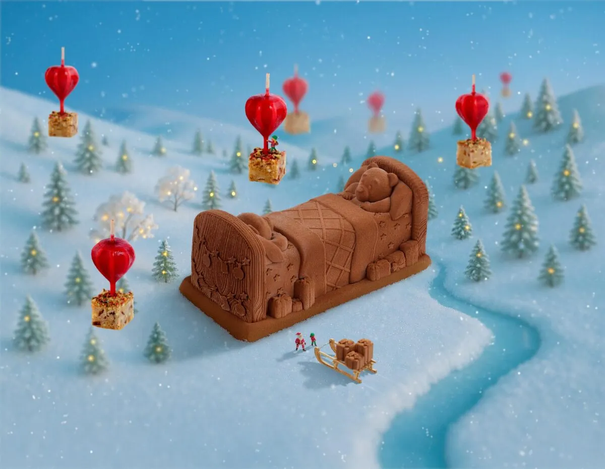 Et la fin ? Une apothéose d’innovation glacée. Au-delà de l’éclat audacieux de la Bûche Création façon Dubaï, le véritable clou du spectacle est la Bûche Glacée Nuit de Noël. De petits oursons dorment paisiblement sur leur lit de cacao, un tableau gourmand qui captive. Composée d’une crème glacée intense au chocolat noir et à la vanille, d’un cœur de brownie au cacao et d’une sauce au caramel beurre salé filante, elle est un pont régressif vers l’âme d’enfant. Sans oublier les Rennes Chocolat Croustillant, prêts à être dévorés avec un sourire.