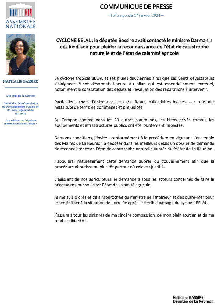 Phénomène d’une rare intensité, Belal a provoqué d’importants dégâts nécessitant d’engager tous les moyens humains et financiers nécessaires afin de venir en aide aux Réunionnais et Réunionnaises sinistrés. La reconnaissance de l’état de catastrophe naturelle permettra d’indemniser les particuliers, les agriculteurs, les professionnels et collectivités sinistrées dans les plus brefs délais et ainsi entamer au plus vite la reconstruction.