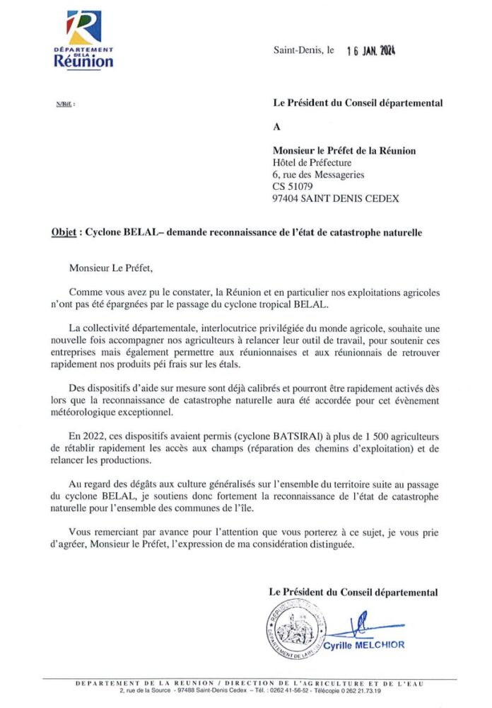 Suite au passage du cyclone tropical Belal sur La Réunion ce lundi 15 janvier, l’Association des Maires Du Département de La Réunion (AMDR) a envoyé un courrier au Premier Ministre, Gabriel Attal, ainsi qu’au Ministre de l’Intérieur et des Outre-mer, Gérald Darmanin, afin de demander en urgence la reconnaissance de l’état de catastrophe naturelle pour La Réunion.