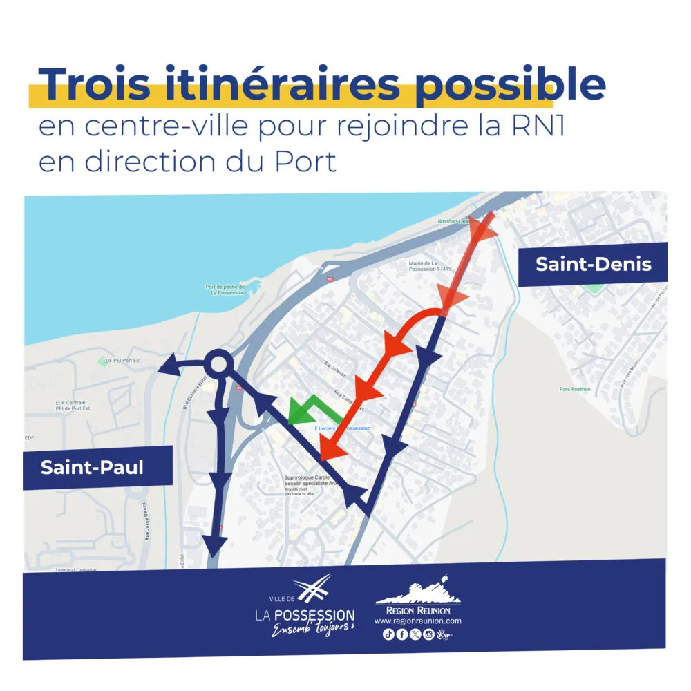 La Région Réunion informe les usagers que les opérations de démontage de l’autopont de La Possession sont maintenues. Toutefois, en raison des précipitations ayant entraîné le basculement de la Route du Littoral sur les voies côté mer, certaines mesures de circulation ont été revues afin d’assurer la sécurité de tous.Le basculement actuel peut nécessiter un ajustement supplémentaire dans le sens Ouest → Nord, notamment au niveau du giratoire de la RD41 :