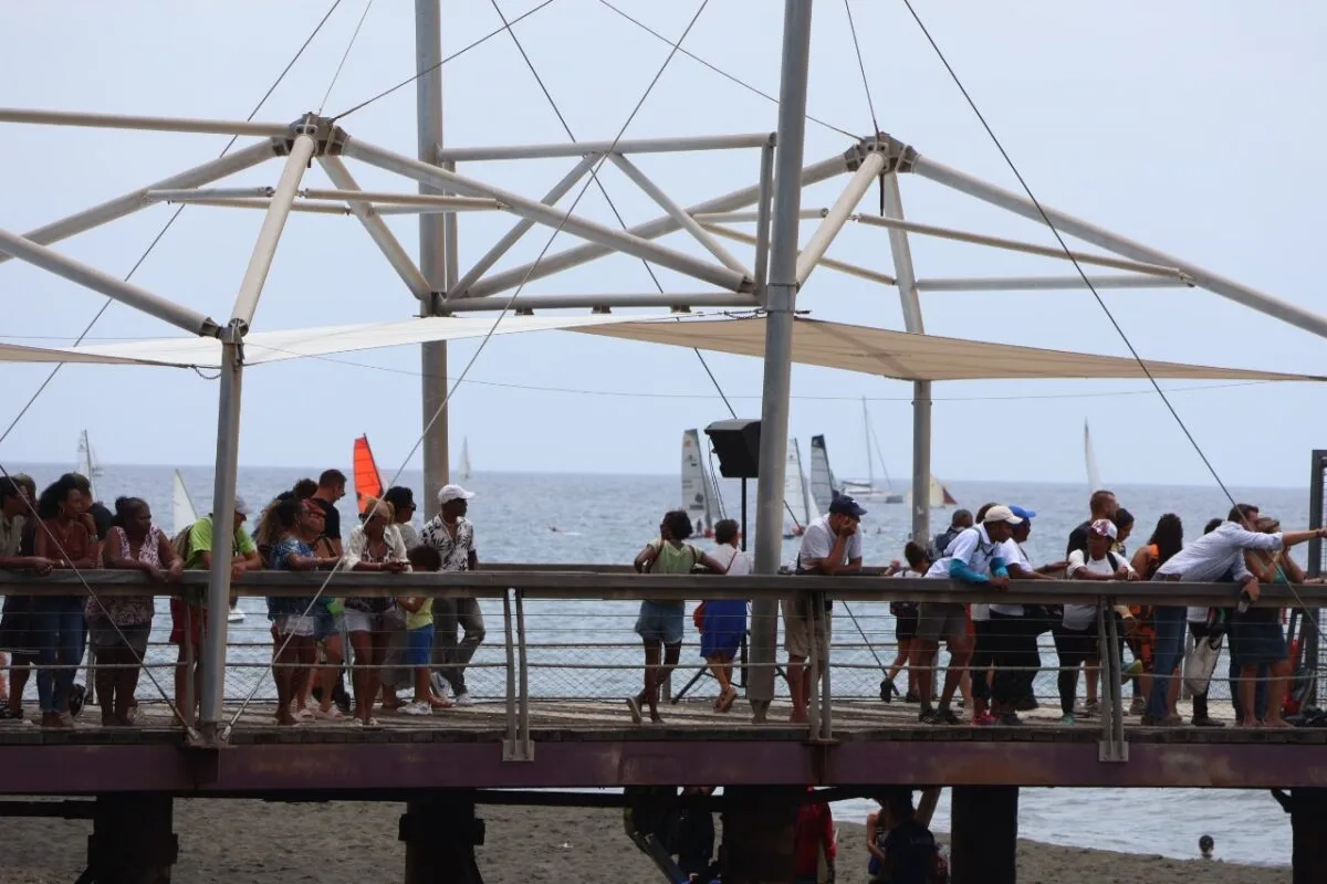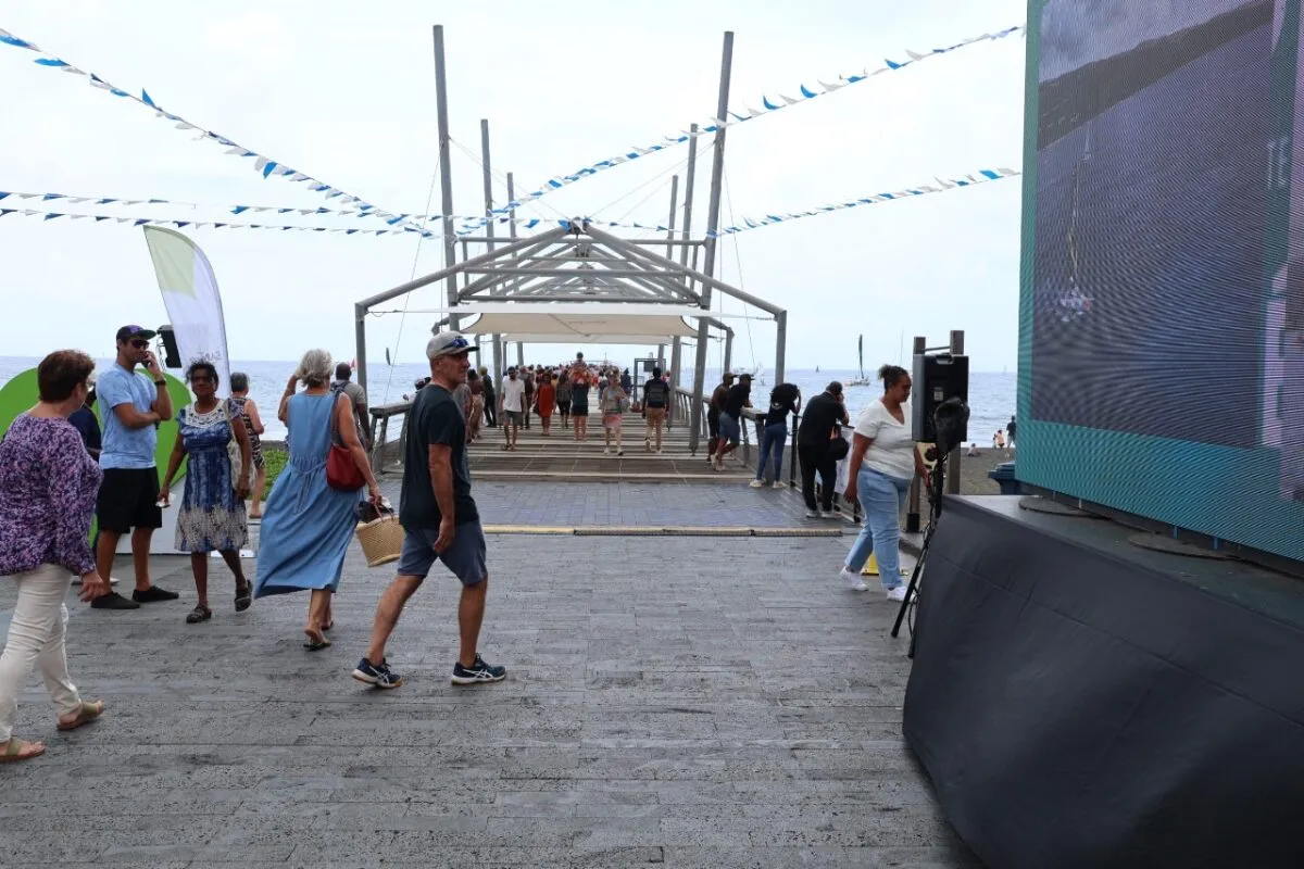 Un débarcadère rempli de monde qui regarde passer le bateau Free Dom